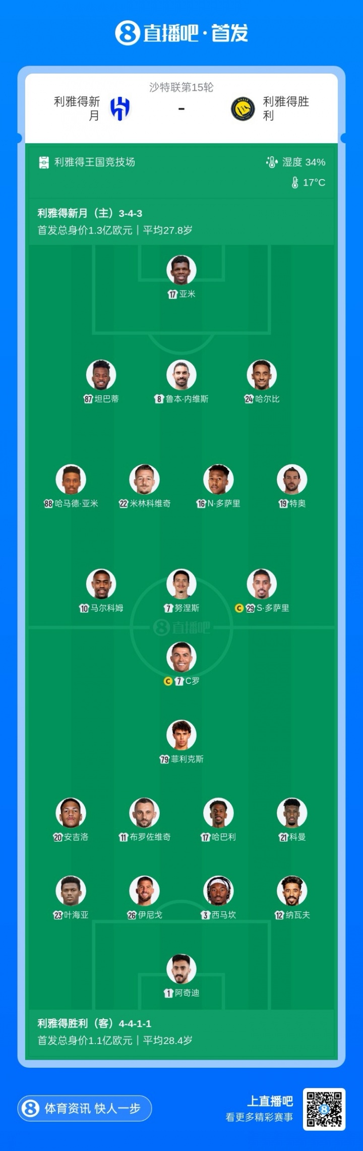 1月13日讯 沙特联第15轮,利雅得新月主场迎战利雅得胜利,赛前首发名单公布。【本场比赛,努内斯将对决C罗,利雅得新月方面马尔科姆、多萨里出战,胜利科曼、菲利克斯出战】